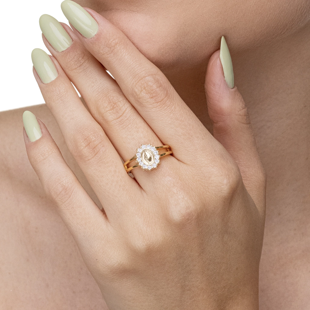Anel com a imagem de Nossa Senhora das Graças, com zircônias cravejadas em volta, super delicado e elegante. A mensagem de Nossa Senhora das Graças é que as graças serão derramadas sobre todas as pessoas, grandes e pequenas, particularmente sobre aquelas que as pedirem com confiança e fervor. Uma peça perfeita para quem ama acessórios com toque minimalista e com significado, um design moderno e ideal para compor o seu mix do dia, trazendo um ar de charmoso para seu look, o anel pode representar autoridade, poder, elegância. A peça perfeita que não pode faltar em seu porta joia.