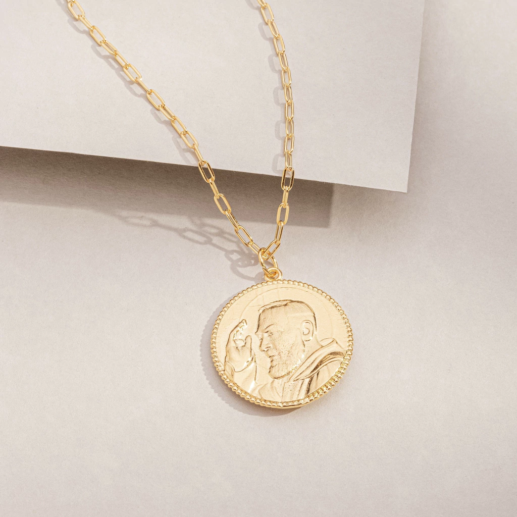 Colar em cartier com medalha dupla face de Padre Pio e São Miguel Arcanjo! Padre Pio foi um sacerdote católico italiano, da Ordem dos Frades Menores Capuchinhos, que é conhecido como santo. Tinha o dom da bilocação, ou seja, a presença simultânea em dois lugares diferentes. Tinha o dom da profecia, era humilde e obediente. Um dos seus ensinamentos era "aprender a reconhecer e adorar a vontade de Deus em tudo". São Miguel arcanjo é um anjo que luta contra o mal, protege a fé e a Igreja, e é considerado o chefe dos arcanjos. Ele ajuda quem está passando por momentos de desespero e traz serenidade para lutar contra as forças ruins. Pra você que ama um colar de significado, religioso e sofisticado para seu dia a dia, essa é a escolha perfeita!