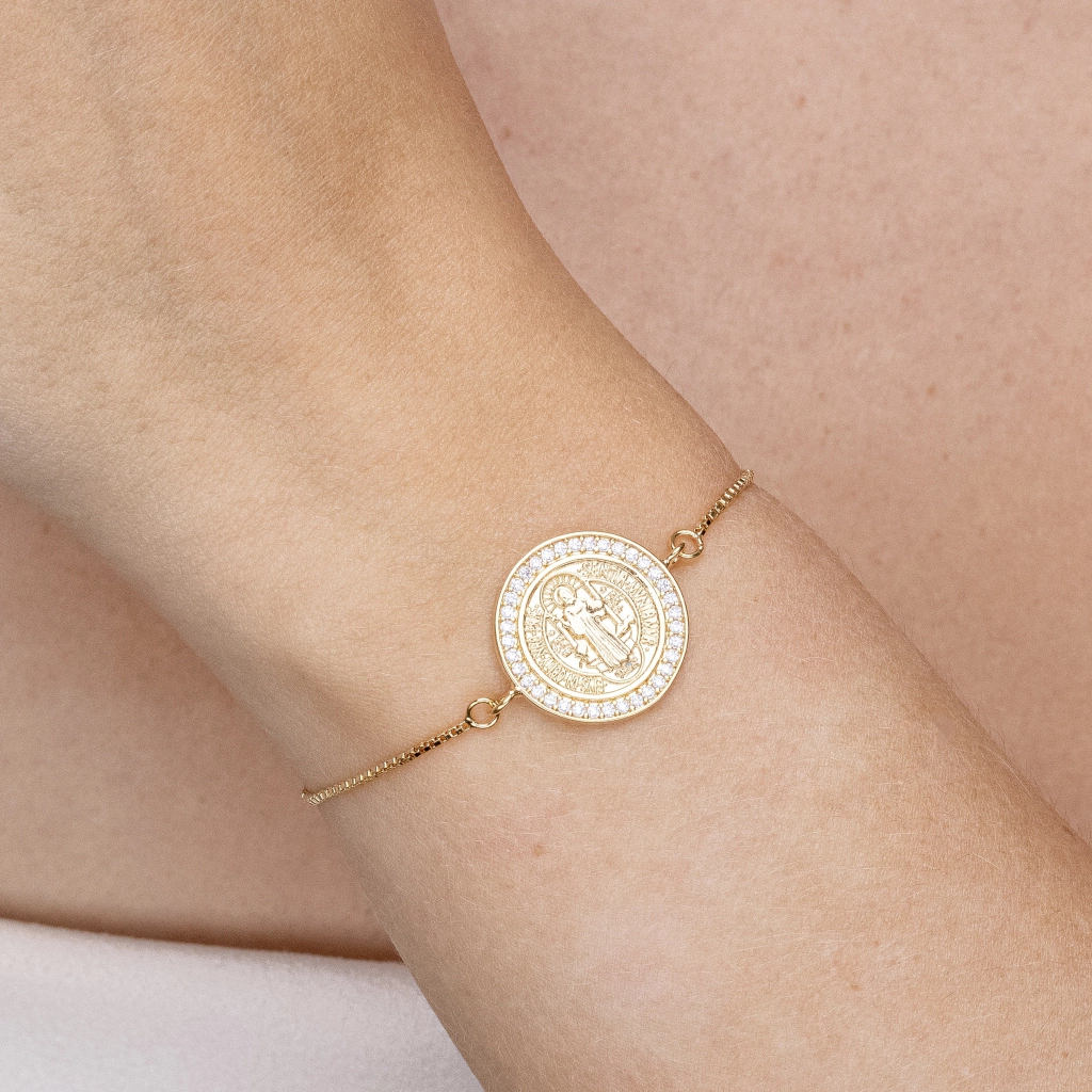 Pulseira com a imagem de São Bento, versátil e trazendo elegância para seu look. Perfeito se você quer transmitir devoção e demonstração de Fé; charmoso e super sofisticado. Aproveite já para garantir e dar um toque minimalista e de significado em seu look do dia. São Bento foi um monge, santo e padroeiro da Europa. Ele é conhecido por ter fundado o Mosteiro de Monte Cassino e por ter escrito a Regra de São Bento, que inspirou a criação de muitos mosteiros ocidentais. É invocado para proteção contra cobras, sequestros, assaltos, brigas familiares, inveja e olho gordo. Essa peça tem zircônias cravejadas em volta da imagem, dando um charme e trazendo modernidade!